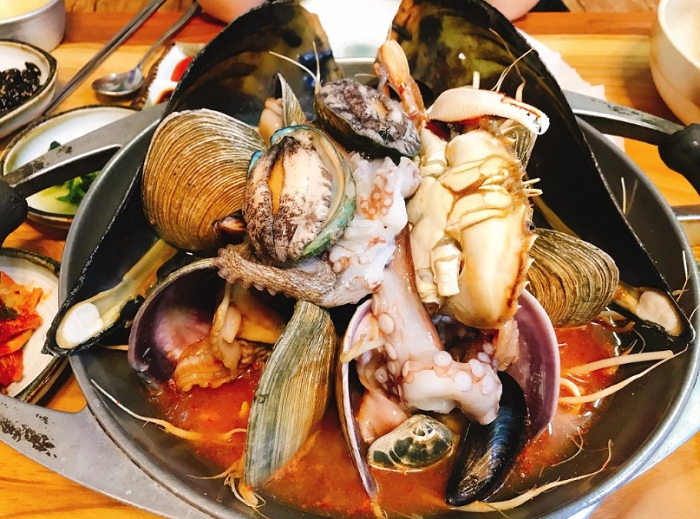 Lẩu hải sản (haemultang) phổ biến trên khắp Hàn Quốc, nhưng phiên bản ở Jeju xuất sắc hơn cả nhờ nguyên liệu đa dạng và tươi ngon. Khi húp một muỗng nước dùng, thực khách sẽ lập tức cảm nhận được sự bùng nổ của các hương vị đậm đà. Hải sản thập cẩm, vài loại rau đặc trưng và tương ớt gochujang kết hợp với nhau vô cùng hợp miệng.