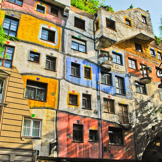 Nghệ sĩ / kiến trúc sư người Đức gốc Áo, Friedensreich Hundertwasser được biết đến với các công trình kiến trúc độc đáo của mình: những căn nhà không đồng đều, hàng tấn màu sắc tươi sáng, và thảm thực vật sống được kết hợp trực tiếp vào thiết kế của ông. Một trong những ví dụ tốt nhất của phong cách của mình, hãy ghé thăm Hundertwasserhaus của Vienna, một tổ hợp căn hộ được xây dựng trong những năm 1980.
