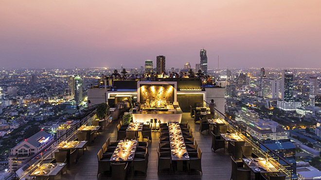 Từ tầng thượng này bạn có thể ngắm nhìn 360 độ Bangkok và bầu trời đêm sao đêm gần đến mức như có thể chạm tay vào. Một bữa tối lung linh ánh nên trên chiếc bàn nhỏ lý tưởng cho hai người thì còn gì lãng mạn bằng.