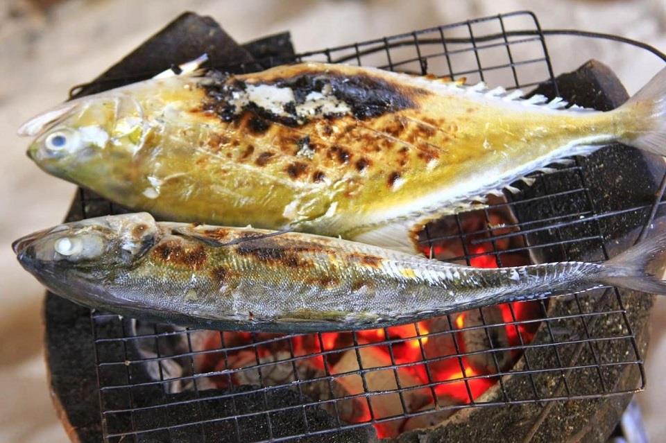 Những chú cá tươi roi rói được bọc trong lá chuối hấp chung với loại lá có tên bai cha-ploo hoặc đem bọc muối nướng trên bếp than hồng. Bạn sẽ không khỏi ấn tượng bởi vị tanh ban đầu sau đó cảm nhận vị thơm ngọt của từng miếng thịt trắng phau dai dai ấm nóng khiến bạn suýt xoa khi thưởng thức. Bên cạnh đó bạn có thể thưởng thức thêm món mực, bạch tuộc nướng.