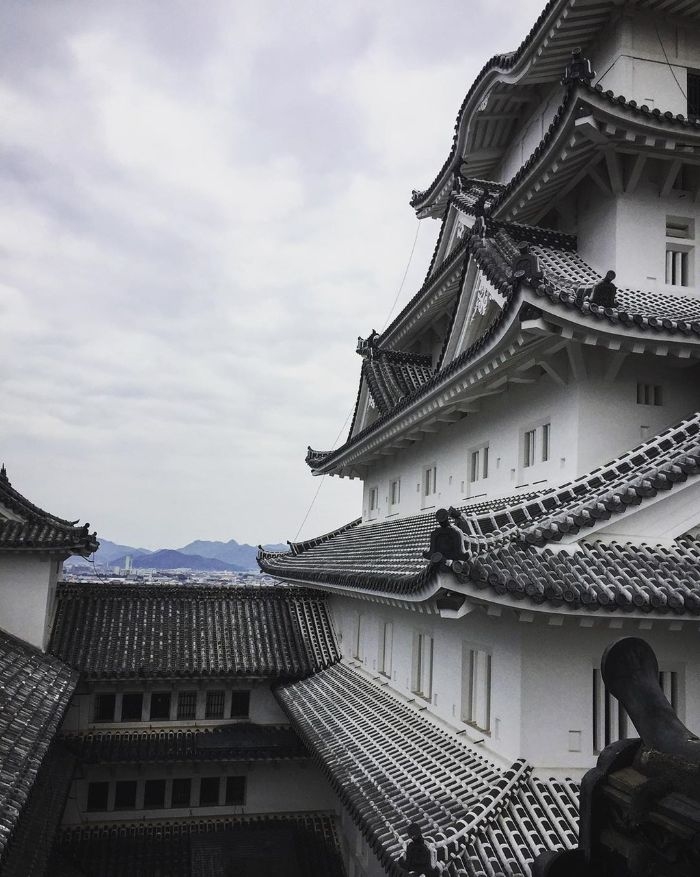 Một trong những nét nổi bật về dáng vẻ bên ngoài của tòa lâu đài Himeji là màu bạc của mái ngói kết hợp hài hòa với màu trắng của vách tường. Ảnh: aliyah.ua