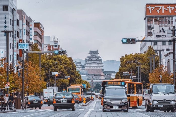 Để đến Himeji, du khách mất khoảng một giờ đi tàu Shinkansen hoặc xe điện từ thành phố Osaka đến nhà ga Himeji và mất thêm khoảng 15 phút đi bộ. Ảnh: mrbyx.