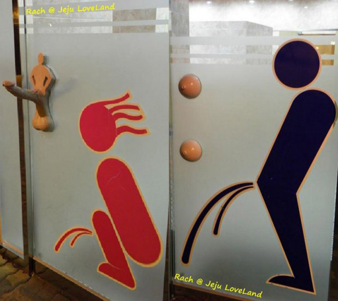 Ngay cả nắm đấm cửa nhà vệ sinh cũng được thiết kế nghịch ngợm thế này đây. Cho các quý bà, nắm đấm cửa có hình như dương vật đang cương cứng, còn các quý ông thì có hai bầu thiên nhiên để cầm nắm.