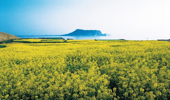 Vào mùa xuân, núi Seongsan Ilchubong rực vàng hoa cải dầu, bạn chắc chắn sẽ chụp được những bức ảnh đẹp hoàn hảo giữa một cánh đồng hoa cải rộng lớn trên đỉnh núi lửa !