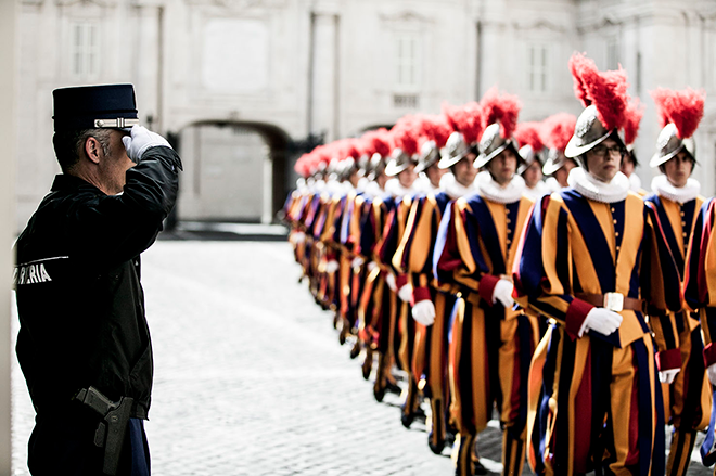 Khi đến Vatican, du khách dễ dàng gặp “The Swiss Guard” - đội vệ binh người Thụy Sĩ. Trong bộ quần áo đầy màu sắc theo phong cách thời phục hưng, họ bắt đầu bảo vệ giáo hoàng từ năm 1506. Đó là khi giáo hoàng Julius II lên nắm quyền, ngài theo bước rất nhiều người có địa vị tại châu Âu, thuê một đội quân Thụy Sĩ để đảm bảo an toàn.