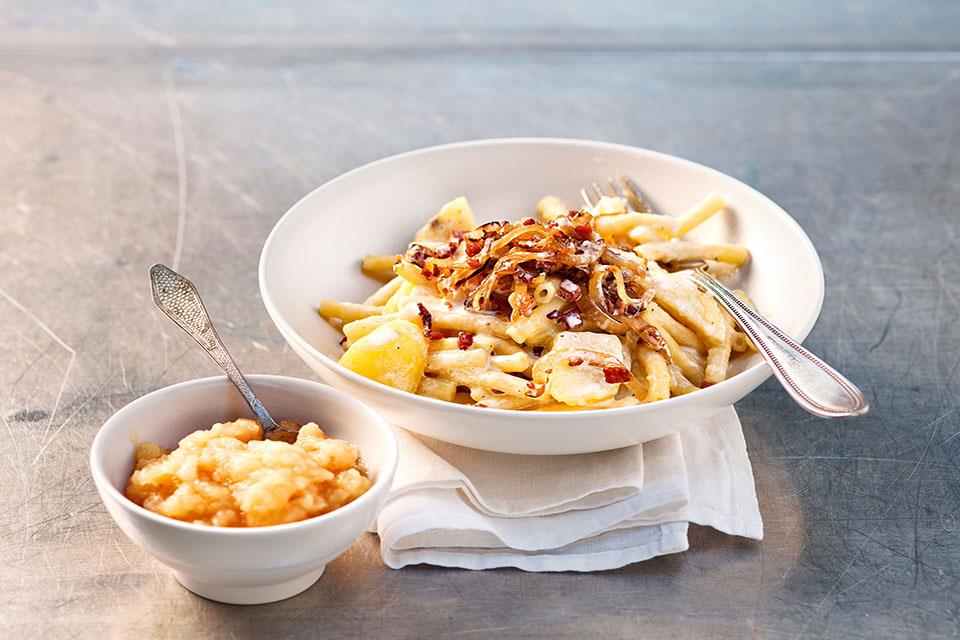 Có nguồn gốc từ nước láng giềng Đức, Älplermagronen là một biến thể thú vị được chế biến từ loại mì ống macaroni. Món ăn này là một bản giao hòa tuyệt hảo của phô mai, khoai tây, hành tây, sữa và kem... Nguyên liệu đặc biệt nhất chính là táo, được hầm mềm cùng mì để tạo độ ngọt tự nhiên. Thịt xông khói, xúc xích... cũng là thành phần phổ biến được kết hợp mang đến tổng thể hương vị đặc sắc.