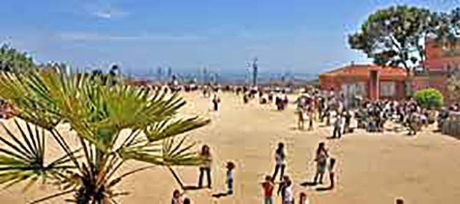 Một sân thượng lớn ở giữa công viên với một chiếc ghế khảm dài xinh đẹp nơi bạn có thể thư giãn và thưởng thức nghệ thuật, kiến trúc, con người và có một cái nhìn toàn cảnh của Barcelona.