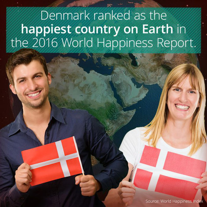 Theo báo cáo hạnh phúc thế giới (World Happiness Report) năm 2016 được xuất bản bởi cơ quan Mạng lưới Giải pháp phát triển bền vững của Liên Hợp Quốc (UN Sustainable Development Solutions Network), Đan Mạch là quốc gia hạnh phúc nhất.