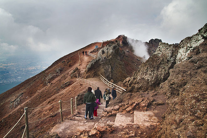 Trên đường chinh phục đỉnh núi lửa Vesuvio, bạn không thấy có điều gì khác biệt so với các ngọn núi khác, có chăng chỉ là ít cây cỏ hơn, đá nham thạch lỗ chỗ như tổ ong và đâu đó có dăm ba sợi khói hiền lành bay lên từ khe núi. Đứng trên đỉnh Vesuvio, bạn sẽ thấy cả vùng vịnh trù phú Napoli, biển xanh ngắt, trời xanh thẳm và lòng dào dạt bình yên như thể người dân Pompeii đứng trước sân nhà ngước nhìn bầu trời của hơn hai ngàn năm trước…