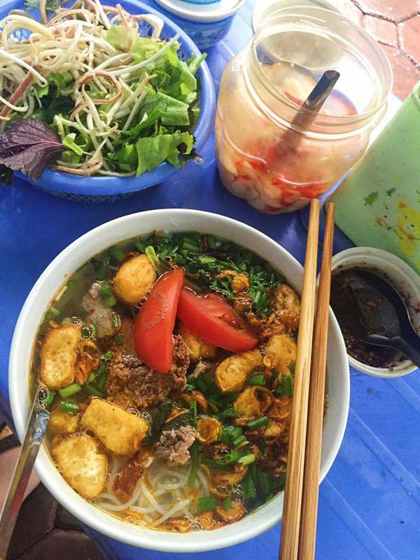 Bát bún riêu với màu đỏ sẫm của cà chua, nước dùng đậm đà, gạch cua thơm lừng mùi mỡ hành nhìn thôi đã thấy hấp dẫn. Bún riêu có thể ăn chung với thịt bò, sườn sụn, ốc, đậu rán và các loại rau thơm thanh mát. Những địa chỉ được tín đồ của món bún riêu truyền tay nhau là quán chị Trang trên phố Nguyễn Siêu, gánh bún trong ngõ Hồng Phúc, bún riêu Hàng Lược, Triệu Việt Vương…