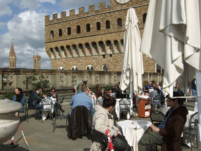 Sau một vòng tham quan Phòng trưng bày Uffizi và chiêm ngưỡng những tác phẩm nghệ thuật ở đây, du khách có thể thư giãn và thưởng thức giải khát tại quán cà phê trên tầng mái của Uffizi, nơi cung cấp các bữa ăn nhẹ và đem đến tầm nhìn tuyệt vời khắp Piazza della Signoria và xa hơn nữa. Quán cà phê chỉ dành cho những người đã trả tiền để vào phòng trưng bày.