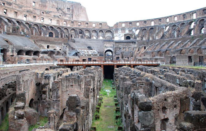 Các mái vòm bên trên tầng trệt tạo ra 80 lối vào chỗ đông người, mỗi lối vào có đánh số giúp khách tìm thấy chỗ ngồi của họ. Một tấm vải bạt khổng lồ che nắng che mưa thường được căng ra bên trên để che nắng và trong các buổi trình diễn đêm, một đèn chùm bằng sắt khổng lồ treo lơ lửng bên trên đấu trường. Tuy nhiên, qua nhiều thế kỷ, nó đã bị hư hỏng do thiên nhiên tác động (động đất). Chu vi phía bắc của Đấu trường vẫn còn nguyên với dấu vết trùng tu của thế kỷ 19. Phần còn lại của Coloseo ngày ngày nay là bức tường gốc như lúc đang xây.