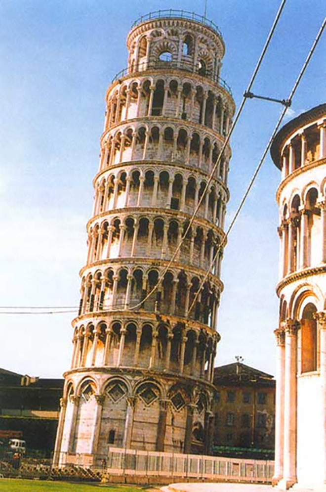 Tháp nghiêng Pisa khi mới xây dựng có dáng thẳng đứng, nhưng khi tầng thứ 3 được hoàn thành, người ta mới phát hiện ra là do móng của nó đào không sâu, tầng móng dưới đất nông ( bởi toàn bộ thành Pisa được xây dựng trên nền một con sông đã được san lấp đầy đất), nên thân tháp dần dần bắt đầu nghiêng.