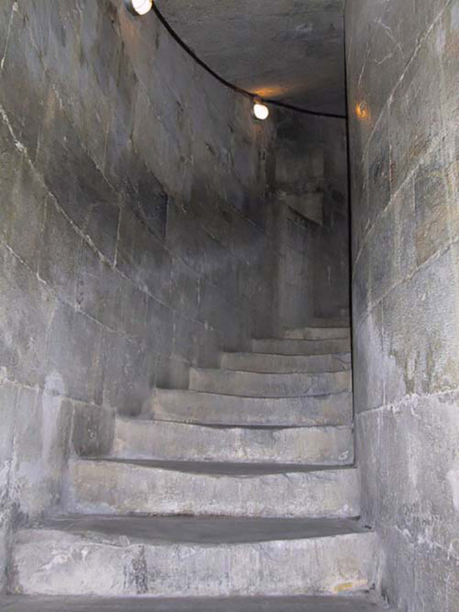 Đặc biệt còn có một cầu thang xoáy ốc dẫn lên đỉnh tháp nằm bên trong vách.
