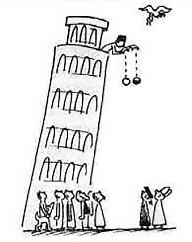 Ông dùng hai vật có trọng lượng không giống nhau thả từ trên đỉnh tháp xuống. Kết quả chúng đồng thời tiếp đất, từ đó bác bỏ phán đoán của nhà bác học nổi tiếng người Hy Lạp Aristotle: “Nhưng vật thể có trọng lượng khác nhau, tốc độ rơi cũng khác nhau”.