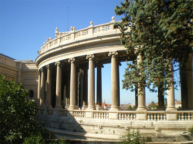 Ở trung tâm của mặt tiền hướng ra đài phun nước có phần nhô, cho phép bố trí một lối vào ở bậc thềm đầu tiên nơi cầu thang lớn và phía trên là lối vào thứ hai nối bởi dãy cột dài. Ngày nay chỉ lối vào đầu tiên của bảo tàng được mở cửa chào đón công chúng, bảo tàng nghệ thuật vẫn đang trong thời gian tu sửa và phải đợi vài năm nữa du khách mới có thể ghé thăm.