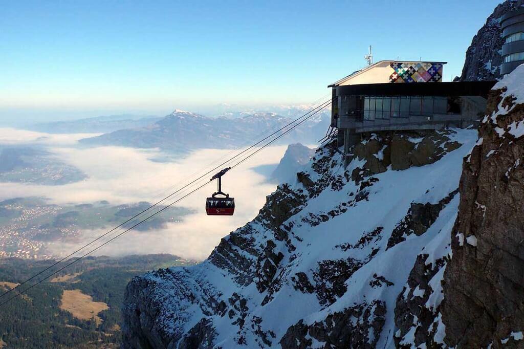 Núi Pilatus nằm trên thành phố Lucerne, với tầm nhìn tuyệt vời đến hồ Lucerne và dãy núi Alps của Thụy Sĩ. Ngọn núi này sở hữu vẻ đẹp ngoạn mục mà hùng vĩ khi mùa đông đến. Dù cho trời có nhiều mây thì từ trong cáp treo du khách vẫn phải cảm thán trước khung cảnh tuyệt vời ngoài khung cửa. Chắc chắn đây sẽ là một trong những trải nghiệm đáng nhớ nhất khi đi du lịch Thụy Sĩ mùa đông.