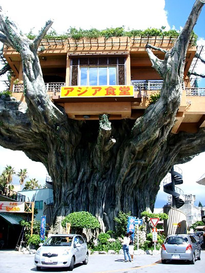 Ngồi trên cây, du khách vừa có thể ngắm nhìn cảng biển Naha vừa thưởng thức món ăn truyền thống của Okinawa.