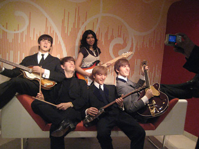 Ban nhạc The Beatles có thêm thành viên nữ? Ồ không, một nữ du khách gảy đàn bên bức tượng sáp của các thành viên nhóm The Beatles