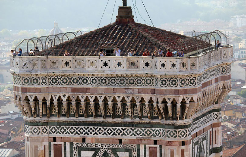 Khi ông qua đời năm 1337, ông mới chỉ hoàn thành tầng dưới với kè bên ngoài bằng đá cẩm thạch: đó là các mẫu đá cẩm thạch trắng từ Carrara, đá cẩm thạch xanh từ Prato và đá cẩm thạch đỏ từ Siena. Tầng dưới này được trang trí trên ba mặt với các phù điêu trên các tấm hình lục giác, bảy cái ở mỗi mặt. Khi cửa ra vào được mở rộng vào năm 1348, hai tấm đã được chuyển đến phía bắc đang trống và chỉ sau đó, năm chiếc nữa được đặt từ Luca della Robbia vào năm 1437.