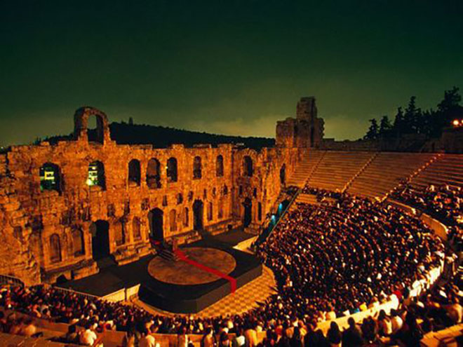 Trong một nét đẹp văn hóa đã tồn tại hàng thế kỉ qua, mọi người sẽ tập hợp lại khi trời tối tại Nhà hát Herodes Atticus ở Athens để xem những màn trình diễn nghệ thuật đầy kịch tính và sôi động. Khoảng năm 160 trước Công nguyên, triết gia Hy Lạp Herodes Atticus đã xây dựng hội trường dốc thoải này làm quà tặng cho vợ mình.