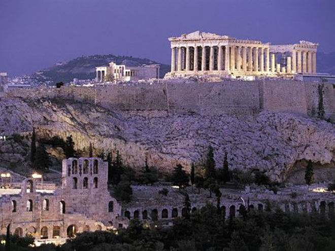 Thành phố Acropolis, được xây dựng từ thế kỉ thứ 5 trước Công nguyên để tôn vinh Hy Lạp sau chiến thắng vẻ vang trước quân Ba Tư trong trận Marathon, đứng uy nghiêm trên nền đá vôi và cách biệt với đô thị Athens hiện đại và nhộn nhịp bên dưới. Ngôi đền Parthenon – tiêu biểu và là niềm tự hào của Athens, sáng rực màu cẩm thạch trắng trong nền hoàng hôn tối dần.
