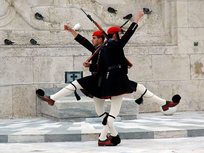 Trên ảnh là hai evzones, những thành viên tinh nhuệ của Lực lượng Cảnh sát Tháp tùng Tổng thống Hy Lạp, có nhiệm vụ bảo vệ Tổng thống và các thành viên Quốc hội. Hai evzones đang trao đổi phiên giác tại Lăng Liệt sĩ Vô danh trước toà nhà Quốc hội ở Athens.